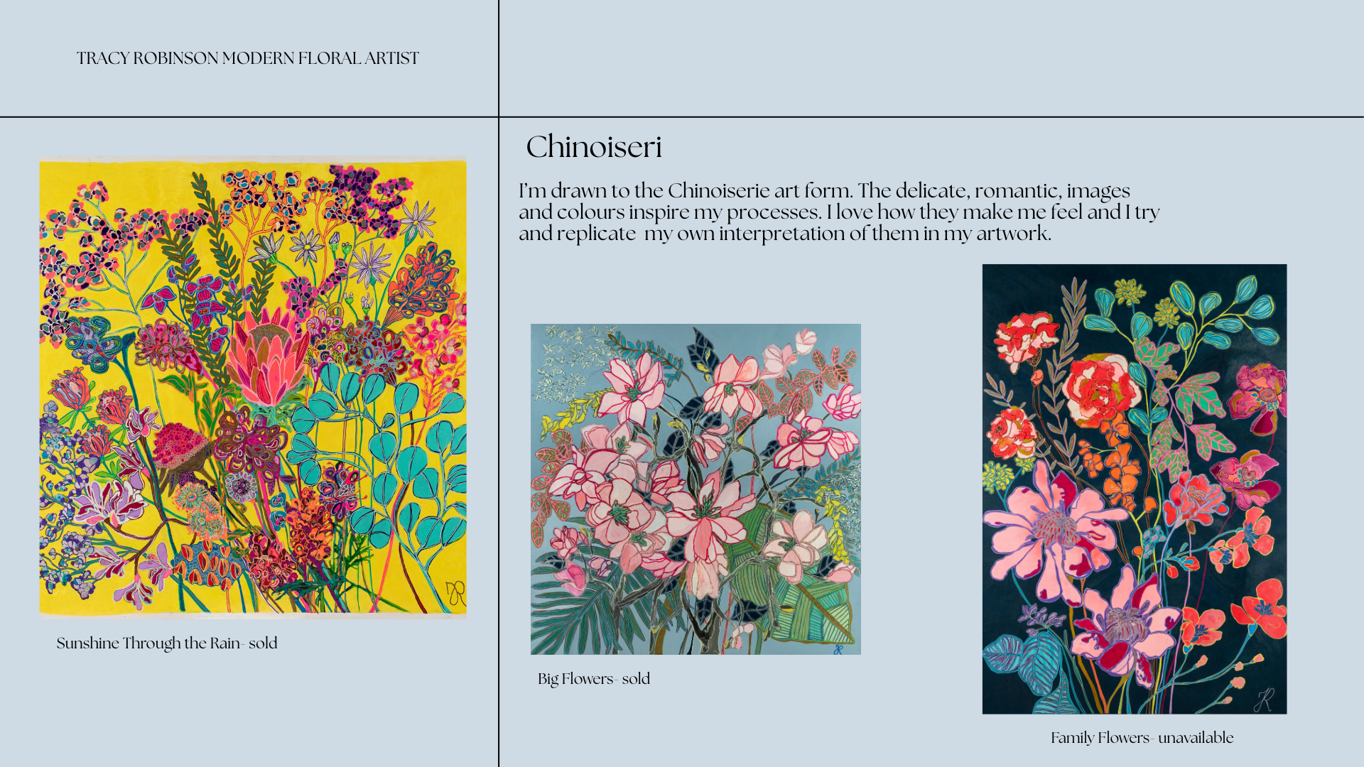 I am an artist based in Fremantle, Western Australia and I have always had a love for bright, beautiful colours. My work is inspired by nature and I like to call it “Imaginary Botanicals.”